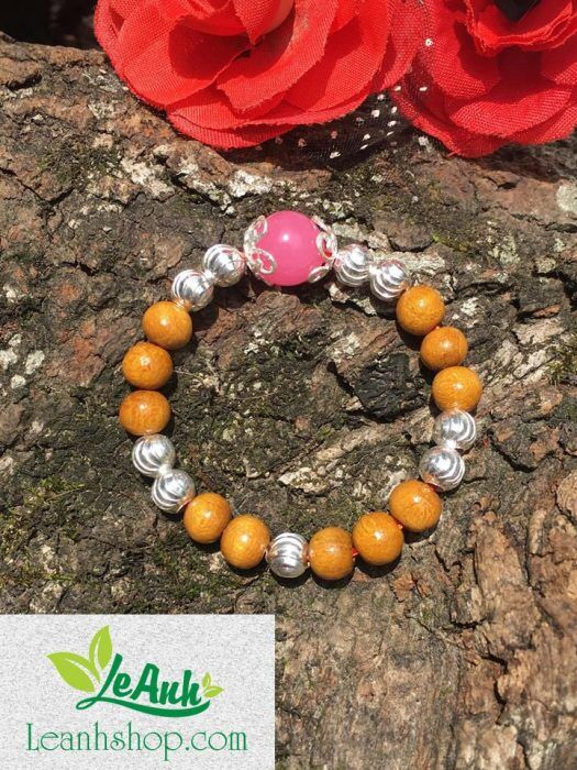 Vòng dâu tằm cho bé gái mệnh Hỏa, với viên bi đá thạch anh màu hồng và 9 bi bạc.