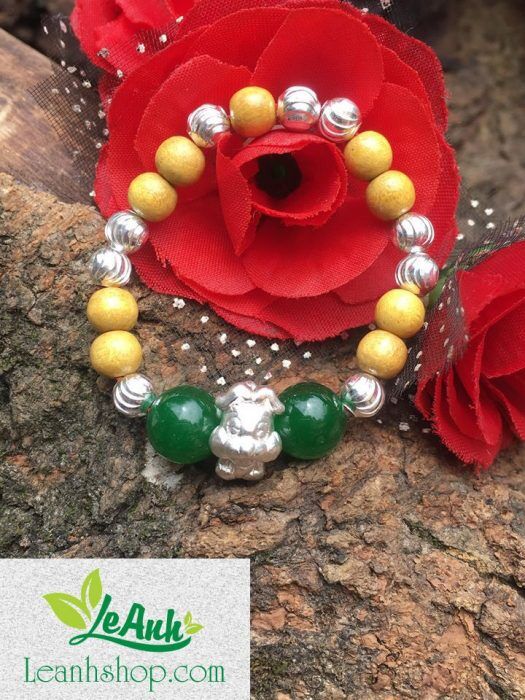Vòng dâu tằm cho bé gái với con giáp bạc gà con hợp bé tuổi Dậu, mệnh Mộc hoặc mệnh Hỏa với 2 bi đá thạch anh màu xanh lục.