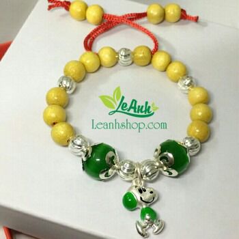 Vòng dâu tằm cho bé trai với 7 bi bạc và 2 bi đá màu xanh hợp mệnh Thủy và Mộc.