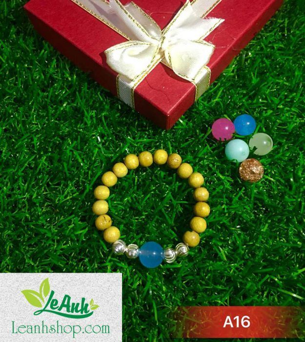 Vòng dâu tằm A16 gồm 4 bi bạc và 1 bi đá xanh lam cho bé gái – bé trai mệnh Thủy.